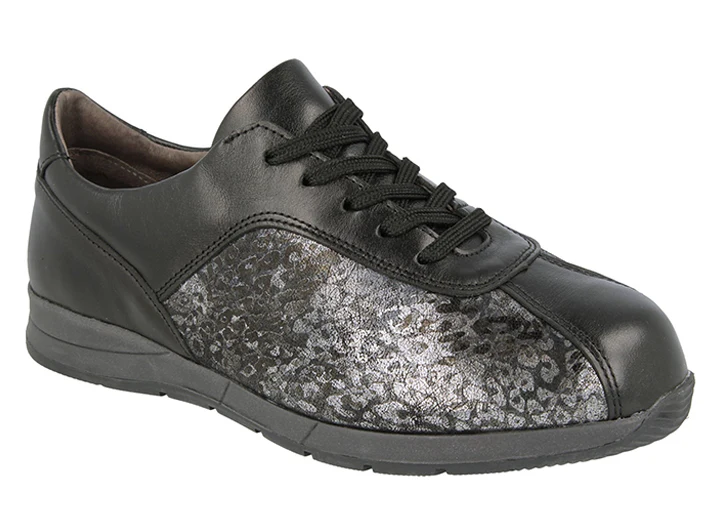 Stylish athleisure shoe in soft leather, with sparkly metallic print stretch panel detailing.